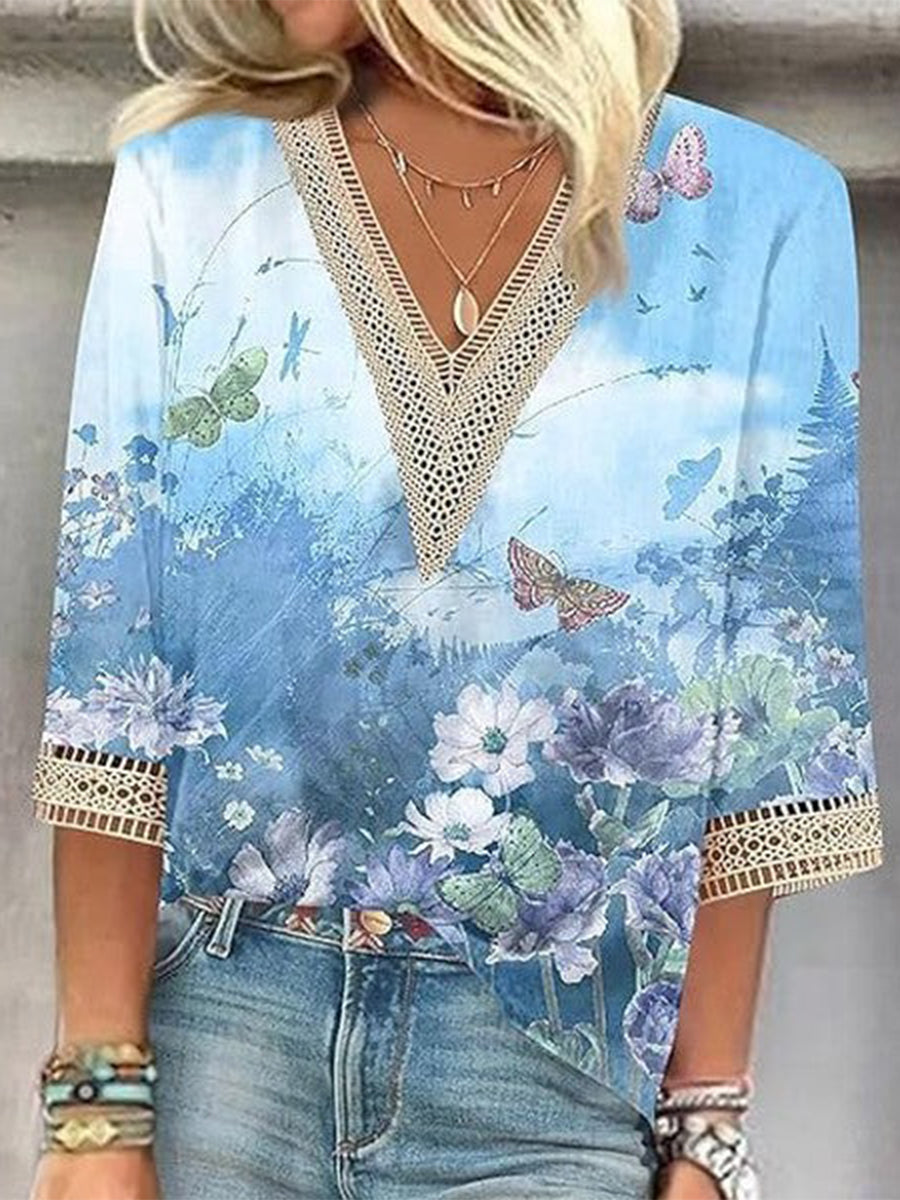 Chemisier romantique en dentelle imprimée à manches 3/4