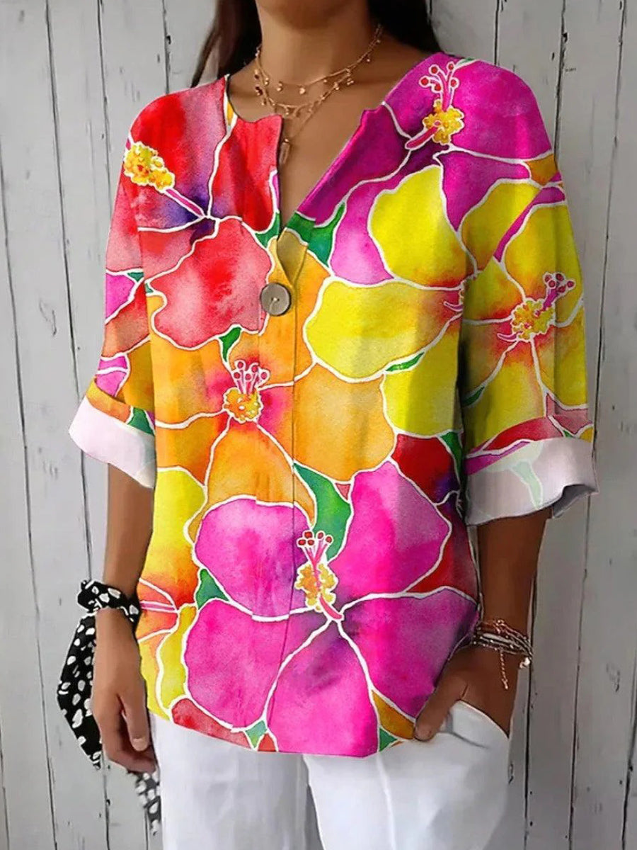 Sublimez votre garde-robe avec ce top sophistiqué à col V et imprimé floral. Doté d'un décolleté flatteur qui met en valeur la silhouette, ce modèle allie des motifs floraux romantiques à une élégance pratique. Sa coupe soigneusement étudiée offre une grande polyvalence pour les occasions décontractées et semi-formelles, tandis que son tissu de qualité garantit un confort optimal tout au long de la journée.
