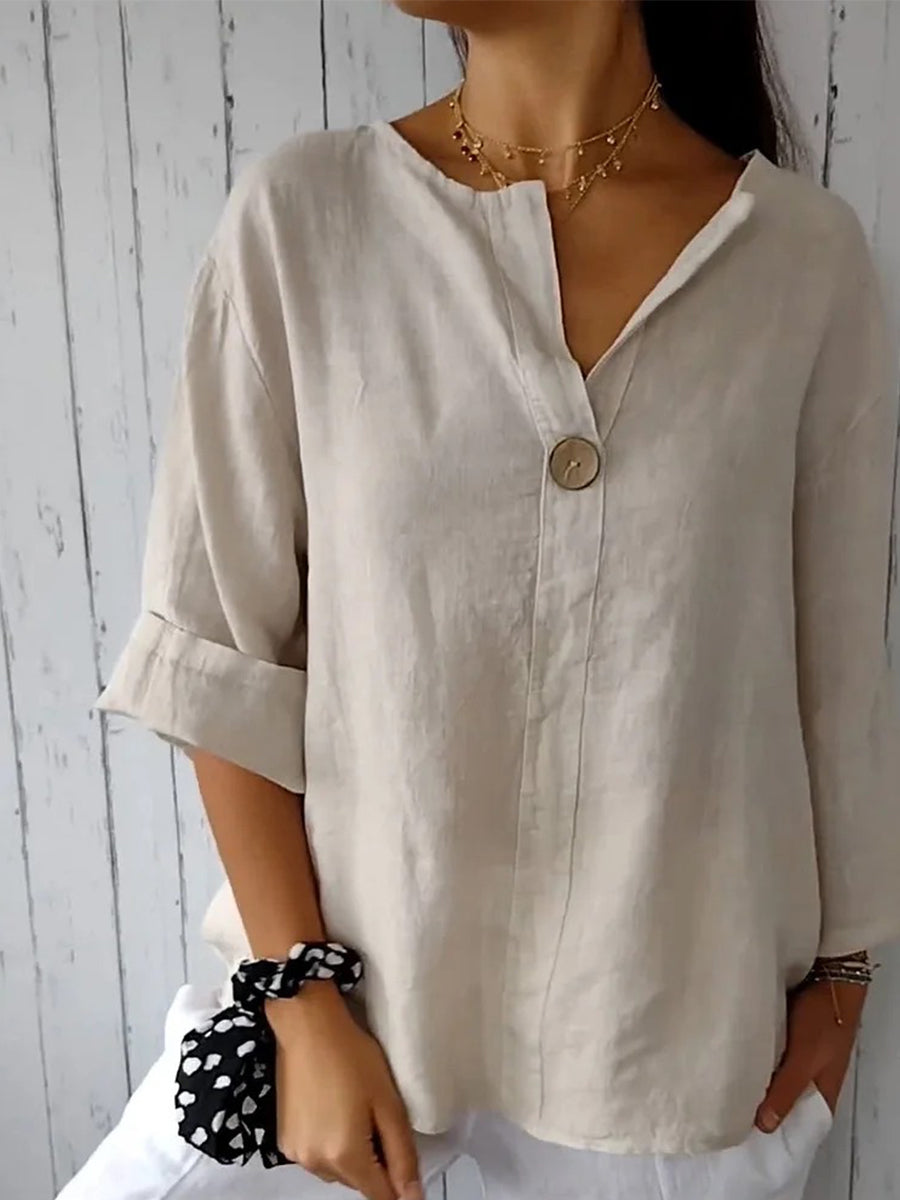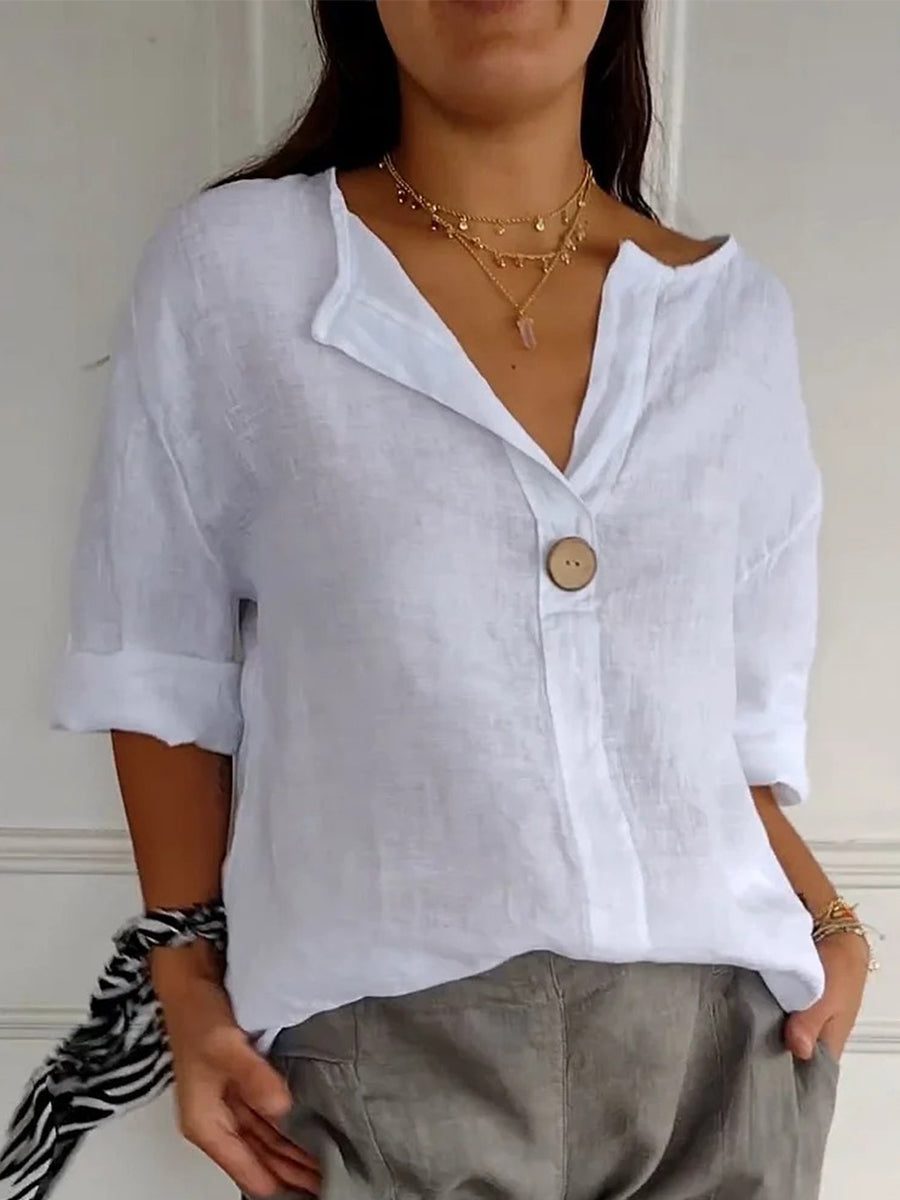 Ce chemisier boutonné à col en V et manches courtes apporte une touche d'élégance discrète à toutes vos tenues. Portez-le décontracté avec un jean ou plus habillé avec une jupe.