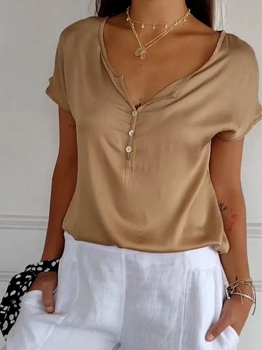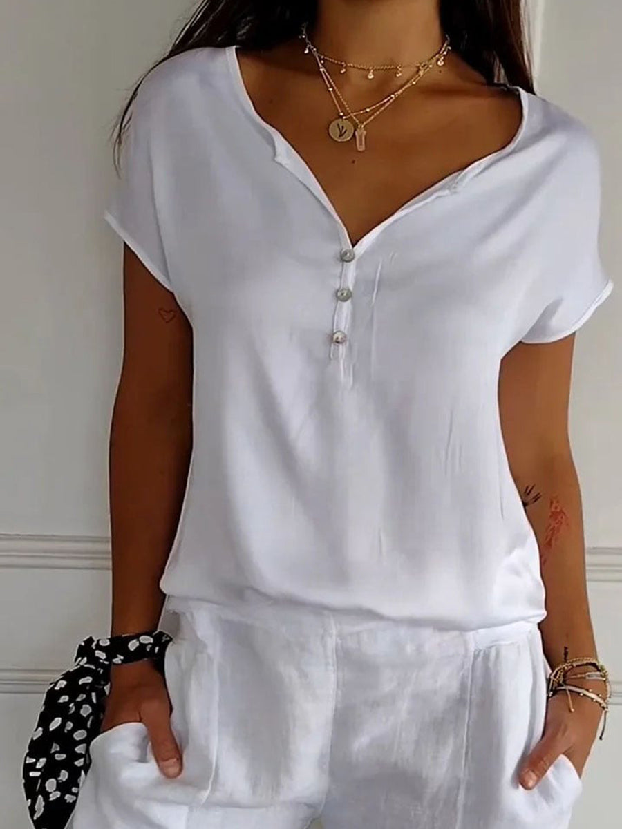 T-shirt uni à manches courtes et col en V boutonnéT-shirt uni à manches courtes et col en V boutonné