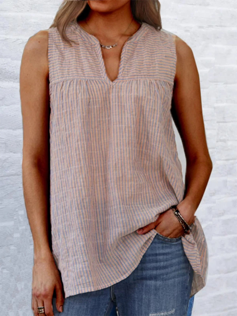 Ce chemisier rayé sans manches à col V allie un motif classique à une coupe moderne et décontractée. Le col V apporte une touche de féminité et allonge le cou, tandis que l'absence de manches assure fraîcheur et confort, idéal pour les journées plus chaudes ou à porter sous une veste. Le motif rayé lui confère un charme intemporel et une touche d'originalité. Parfait pour les sorties décontractées, il se marie facilement avec un jean, un short ou une jupe pour un look chic et sans effort.
