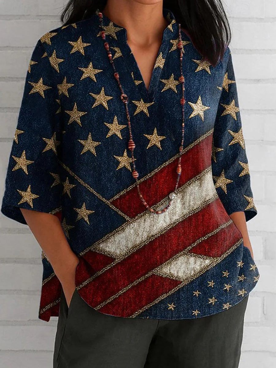 Haut bleu élégant à col en V et manches 3/4