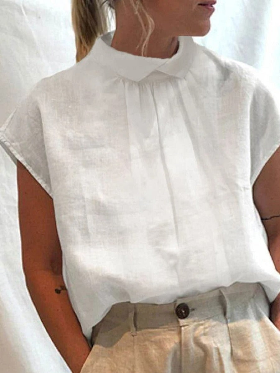Ce chemisier blanc à manches courtes et col montant chic apporte une touche de modernité à sa silhouette classique. Ses manches courtes offrent une coupe décontractée, idéale pour les journées chaudes ou à porter sous une veste. Ce modèle polyvalent s'accorde avec différents bas, des jupes aux pantalons, pour un look à la fois élégant et décontracté.