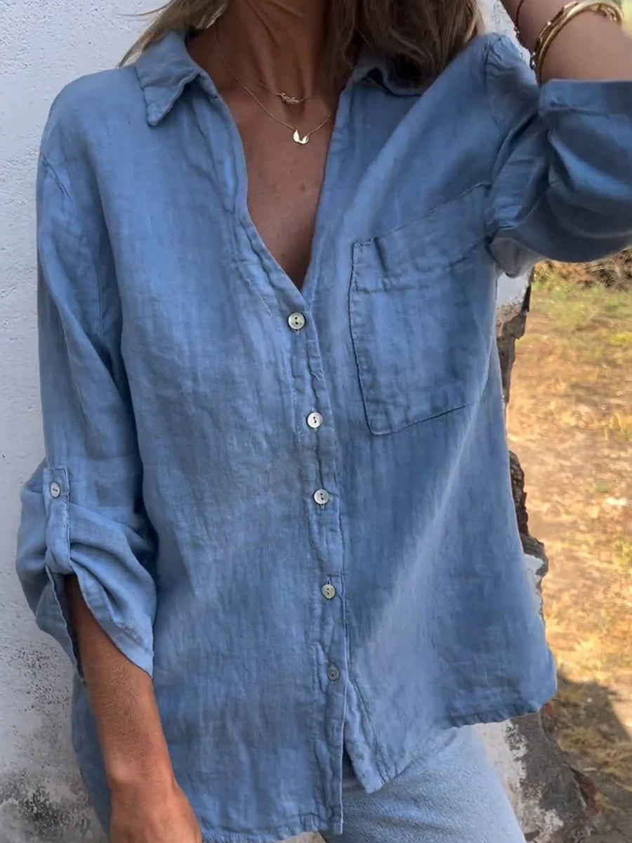 This 3/4 sleeve lapel shirt is crafted from a premium blend of cotton and linen, offering a breathable and lightweight feel for all-day comfort. The solid color and tailored lapel collar create a clean, sophisticated look that’s perfect for work or casual outings. Its versatile design pairs effortlessly with jeans, trousers, or skirts, making it a must-have wardrobe staple for effortless style.