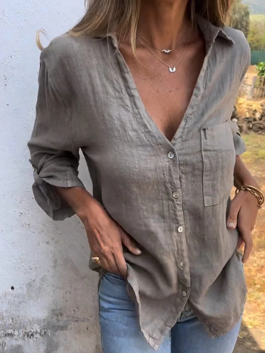 Cotton and Linen 3/4 Sleeve Solid Lapel Shirt
