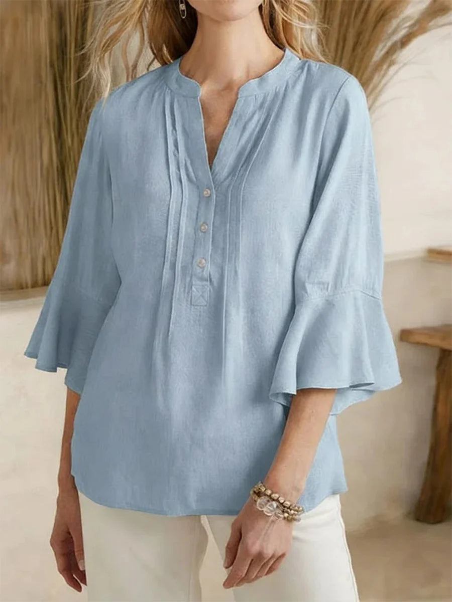 Lightweight casual top with a relaxed loose fit, flattering V neck, and three quarter sleeves, designed for comfortable everyday wear.