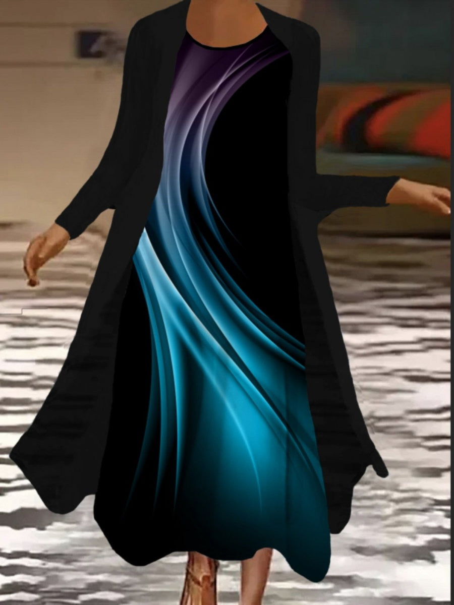 Abstract Printed Long Sleeve Round Neck Two Piece Maxi Dress